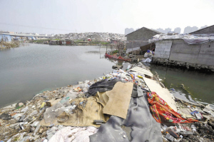 | 童王河周围垃圾成堆。记者 王增芳 摄 |