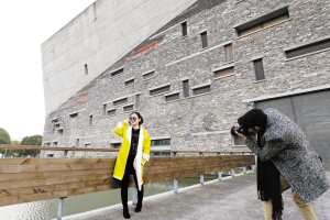 | 11月26日,洪璐和方赐恩在宁波博物馆前拍照。 |
