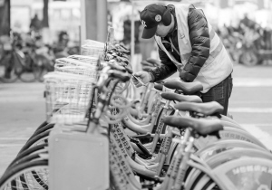 | 昨天上午,公共自行车管理员检查自行车。记者 刘波 摄 |