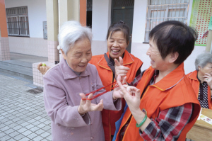 | 新芝社区“九九忆重阳”游园会,志愿者与高龄老人玩游戏。(资料图) |
