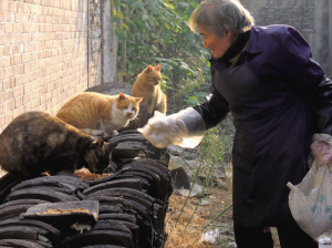 | “猫奶奶”陈美英在喂猫。(摄于2014年2月21日) |
