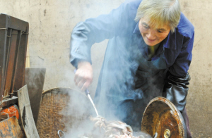 下午1点多老人在家门口煮猫食。 (摄于2013年12月2日) |
