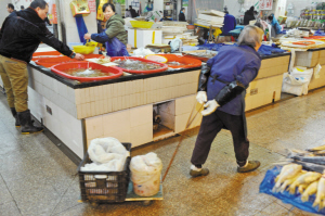 | 上午10点多,老人在咏归菜市场捡一些鱼内脏。(摄于2014年2月21日) |