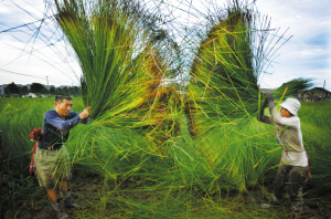 昨天清晨,在鄞州区高桥镇蔺草田里,来自重庆的一对夫妇在挥汗如雨收割蔺草。今年,由于全市蔺草种植面积比往年减少,预计本月上旬即可收割完毕。