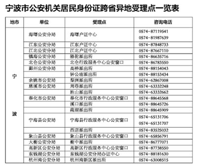 笔者近日从市公安局了解到,从7月1日起,我市异地受理单位由原有的2个增加至20个,覆盖至全市所有县(市)、区(名单附后),需要办理的群众可以选择就近的受理点办理。 市公安局人房管理支队有关负责人告诉记者,该20个受理点目前可为天津、吉林、江苏、安徽、江西、山东、河南、湖北、湖南、重庆、四川等11个省(市)外省籍群众受理异地办证业务,将惠及在宁波市居住的外省籍流动人口250余万人。于此同时,宁波籍人员也可以在上述11个省(市)申请异地办证。异地办证仅限于办理居民身份证,不包括临时居民身份证。 孙波 张海燕 异地办证需符合哪些相应条件 在我市有合法稳定就业、就学、居住的外省籍人员,并符合下列情形之一的,可以在实际居住地的异地办证受理点申请办理居民身份证有效期满换领、损坏换领和丢失补领业务: (一)已领取《浙江省居住证》的; (二)已领取《浙江省临时居住证》,依法签订劳动合同或持有工商执照,同时按照国家规定参加社会保险的; (三)持有经教育部门注册的学生证或学籍证明等材料的; (四)已领取《浙江省临时居住证》,实际居住在本人或直系亲属具有合法所有权的房屋或在当地房管部门办理租赁登记备案的房屋,并持有房屋权属证明或房屋租赁合同的。 此外,异地受理居民身份证制度还规定“首次申领居民身份证的”、“因相貌特征发生较大变化且居民身份证未登记指纹信息,难以确认身份的”、“有伪造、变造、买卖、冒领、骗领、冒用居民户口簿、居民身份证、护照、驾驶证和买卖、使用伪造的居民户口簿、居民身份证、护照、驾驶证等国家机关证件行为的”等情形的人群不予受理异地办证申请。 申请人办理异地办证业务必须提交这些材料 (1)已领取《浙江省居住证》的,申请换领居民身份证的,提交本人居民身份证、有效期内《浙江省居住证》;申请补领居民身份证的,提交有效期内《浙江省居住证》并校验户口簿等合法证明。 (2)已领取《浙江省临时居住证》的,申请换领居民身份证的,除提交本人居民身份证外,还需提交依法签订的劳动合同或工商执照,同时提交按照国家规定参加社会保险证明;申请补领居民身份证的,提交依法签订的劳动合同或工商执照,同时提交按照国家规定参加社会保险证明,并校验居民户口簿、护照、驾驶证等能够证明本人身份的合法证件。 (3)已领取《浙江省临时居住证》、没有工作单位的,可凭实际居住的本人或直系亲属具有合法所有权的房屋权属证明或在当地房管部门办理租赁登记备案的房屋租赁合同,以及本人居民身份证申请换领证件;申请补领身份证的,除上述房屋权属证明或房屋租赁合同外,还需校验居民户口簿、护照、驾驶证等能够证明本人身份的合法证件。 (4)学生可凭经教育部门注册的学生证或学籍证明等材料的,办理换领或补领身份证。未满十六周岁的学生须由监护人陪同办理,并提交监护人身份证、户口簿。 申请人自受理之日起30日可以拿到身份证 公安机关自受理之日起30日内完成制证并发放至异地办证受理点。申请人本人或委托人凭《居民身份证领取凭证》领取证件,换领证件的,领取新证时应当交回原证;委托人代领的,应告知要求申请人在30日内到异地办证受理点核验证件信息,但不能办理快证业务。 居民身份证异地受理不增加制发证周期和任何费用。异地受理与户籍地受理一样,群众只需缴纳证件工本费。居民身份证工本费收费标准严格执行《国家发展改革委、财政部关于居民身份证收费标准及有关问题的通知》(发改价格[2003]2322号)规定,有效期满换领居民身份证的,收取证件工本费20元/证,损坏换领、丢失补领的,收取证件工本费40元/证。 公安机关温馨提示,由于目前我省的全国系统还在不断调试完善阶段,为避免在办证过程中出现拥挤和等待时间过长现象,办证群众可采取错时、电话预约等方式,到实际居住地公安机关办理证件,全市公安机关受理窗口将竭诚服务,做好便民利民工作。