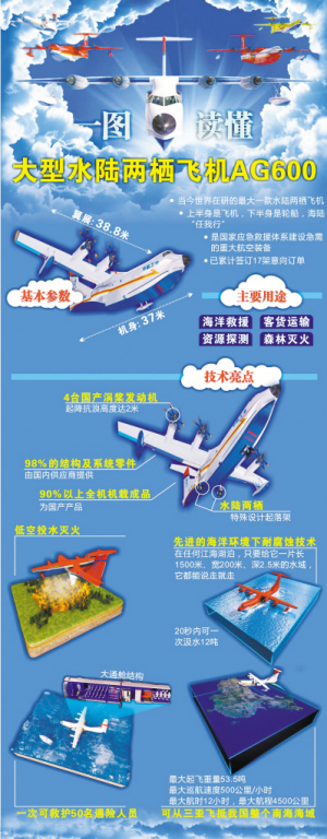 上半身是飞机,下半身是轮船,海陆“任我行”。23日,我国“三个大飞机”中最“特殊”的一个———大型灭火/水上救援水陆两栖飞机AG600在珠海总装下线。 “AG600飞机成功下线,是我国继自主研制的大型运输机运-20交付列装、大型客机C919总装下线后,在大飞机领域研制工作取得的又一重大成果,填补了我国大型水陆两栖飞机的研制空白。”中航工业副总经理耿汝光说。 作为当今世界在研的最大一款水陆两栖飞机,AG600机身长37米、翼展达38.8米,与波音737相当。最大起飞重量53.5吨,最大巡航速度500公里/小时,最大航时12小时,最大航程4500公里。 AG600于2009年6月经国家正式批复立项;2012年攻克关键技术,完成初步设计;2013年完成详细设计;2014年全面转入试制;2015年机体大部件陆续交付和部件总装。计划2016年底实现首飞。 据悉,AG600飞机总体技术水平和性能达到当前国际同类飞机的先进水平,具有完全自主知识产权,并满足中国民航适航规章要求。具备执行森林灭火、水上救援等多项特种任务能力。根据需要加改装后,可满足执行海洋环境监测、资源探测、岛礁补给、海上缉私与安全保障、海上执法与维权等多任务需要。 除水面低空搜索外,AG600飞机还可在2米高海浪的复杂气象条件下实施水面救援,一次可救护50名遇险人员。它在海上救援方面与船舶相比,优势在于速度快,速度是救捞船舶的10倍以上。 据新华社