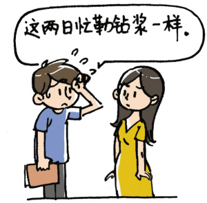 例句:该两日忙勒钻浆一样。[这几天很忙乱。]
