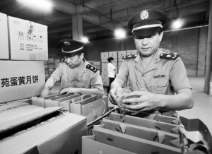 江东区市场监管局启动地产月饼抽检,这也是该区首次全覆盖抽检地产月饼。图为8月1日,工作人员在南苑食品有限公司江东分公司抽检月饼。