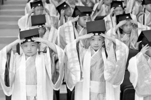 商报讯(记者 房伟 文/摄)“呦呦鹿鸣,食野之苹。我有嘉宾,鼓瑟吹笙……”9月5日下午,在一群身着汉服的小学生优雅的《鹿鸣》吟诵声中,别有特色的宁波市镇海蛟川双语学校新生开笔礼拉开了序幕。 “整个开笔礼有正衣冠、朱砂启智、感恩鞠躬、启蒙描红、击鼓明志、礼成等多个环节。”校长助理、德育处主任杨旦妮向记者介绍道,庄重的仪式让所有孩子感受到入学读书是人生中的一件大事,“也通过这种特别的方式,让孩子们领略传统文化的魅力”。 原来,在古代学童入学前,都会有启蒙师长用红色的朱砂在他们的额头正中点上红痣,俗称“开天眼”。而在老师的示范下,新生们写那个简单而意义深远的“人”字,是为了让学生们懂得:要读书,先做人,而写好一个“人”字,一撇一捺看似简单,只需短短两笔,要学会做人却需要一生的时间。 在开笔礼上,二、三年级小朋友还和一年级新生重温了入学时的誓言:以孝悌谨信为荣,以爱众亲仁为荣,以明理守纪为荣,以博学优雅为荣,以励志笃行为荣,以行健修身为荣。 “能参加这次开笔礼我特别高兴,因为不仅一年级的小朋友们可以点朱砂,老师也给我们点了。老师希望我们从此眼明心亮、笃信好学、切问而近思,成为一个像孔圣人那样有大智慧的人。”二年级的小朋友朱俊宇兴奋地说。