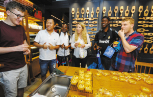 昨天,140多名宁波诺丁汉大学新一届国际留学生以一次“宁波历史文化体验游”,开始了他们在宁波的留学生活。图为留学生们在南塘老街品尝刚出炉的手工月饼。