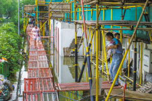 商报讯(记者 刘波 通讯员 毛一波)受14号台风“莫兰蒂”影响,海曙南门街道郎官社区、尹江岸社区、马园社区等低洼地积水严重。为了方便居民出行,各社区发动志愿者和辖区单位,为居民建起便民桥。这10余座大大小小的便民桥,也成了居民口中的“连心桥”。 郎官社区郎官西弄沿河地段因地势低,是积水严重区域。9月16日上午平均积水达35厘米,最深处达到70厘米左右,居民外出严重受阻。考虑到水位一直居高不下无处排水,中山西路立面改造工程部立即从别处调来不锈钢工程架,与郎官社区的志愿者一起,历经3个小时,为居民搭起一座近100米的便民桥。 甬水桥路51弄由于地势低洼,每次下暴雨都容易积水,这次也不例外,最深处达到了80厘米。由于积累了经验,尹江岸社区常态化配备了一座长度为100米的便民桥,方便居民出行。在尹江岸三村门口,社区志愿者自发捐赠出石块,并和社工一起搭建起了60米长的临时便民桥,直通到楼道口,解决了居民的出行难题。 柳锦社区柳西新村紧挨着柳西河,河水倒灌非常严重。社区道路上全是积水,柳西新村14幢和27幢受灾最为严重,最深处达到60厘米,一楼居民家里也进水,居民外出严重受阻。来自中铁一局的志愿者运来沙袋和不锈钢工程架,花费了一个下午的时间,为14幢和27幢的居民搭起了便民桥。住在27幢的陈先生抱着他的孩子走过便民桥,笑着说,昨天多亏有了这个便民桥,不然和父母一起吃团圆饭,也成麻烦事了。 上图为郎官社区郎官西弄沿河地段的便民桥。 记者 刘波 摄
