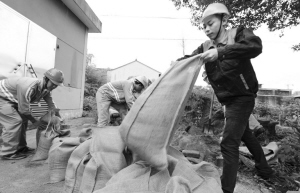 第16号台风“马勒卡”来袭,鄞州区城管局防台物资储备到位。该局在每个泵站配备了移动式水泵,共计50台。此外还配备防汛所需的麻袋近3万只、铁锹430把、柴油2350升、沙子19吨。图为昨天下午,该局排水养护公司员工在鄞县大道泵站装运沙袋。