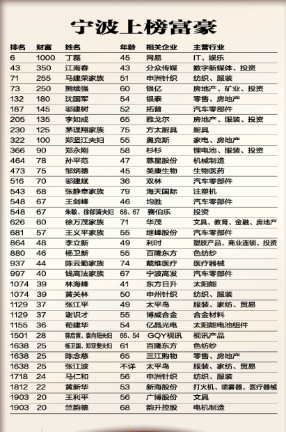 本周五,2016胡润百富榜出炉,2056位企业家财富达到20亿元及以上,荣登榜单。王健林连续三年成为中国首富,马云、马化腾紧随其后,丁磊领衔36位宁波富豪上榜。来围观一下全国以及宁波最有钱的土豪吧。 姚振华成“大黑马” 据胡润团队表示,过去一年财富增长放慢速度。今年有2056位企业家财富达到20亿元及以上,比去年增加179位上榜,为三年来最低涨幅。有1007位企业家财富比去年缩水或没有变化,其中828位财富缩水,上榜企业家平均财富比去年略有下降,从73亿下降到72亿。但新面孔还是蛮多,因此总财富仍然上涨了7%达到14.8万亿,涨幅与GDP差不多。总上榜人数比三年前还是翻了一倍,是十年前的10倍,达到历年之最。703位企业家财富增长,还有346位新人。139位财富增长50%及以上,包括45位财富翻倍。 前阵子,62岁的王健林在媒体上发表的“一亿元小目标”红遍全国。而他与其家族也以2150亿财富第三次成为中国首富。52岁的马云及其家族财富增长41%到2050亿,保持第二。45岁的马化腾尽管慷慨捐赠了139个亿,但财富仍然增长了38%到1650亿,上升1位到第三。 46岁的姚振华是今年的“大黑马”,财富增长最多,翻了9倍到1150亿元,比去年上升200多名到第四。最近一年万科使这位神秘的潮汕大佬备受瞩目。胡润表示:“姚振华财富平均一周涨了20个亿。” 宁波土豪人数 居全国城市第九 前首富、45岁的宁波老乡丁磊以1000亿元上升10位到第六,财富比去年增长近一倍。这是丁磊继2005年之后首次重回胡润百富榜前十名。网易今年二季度营收90亿元,同比增幅96%,其中3/4的收入来源于在线游戏。受益于手游业务的强劲表现,网易市值突破2000亿。 与丁磊一起上榜的还有35位宁波商人(包括出生于宁波与企业总部在宁波),分众传媒的江南春(350亿元)、申洲的马建荣家族(255亿元)、银亿的熊续强(250亿元)、银泰的沈国军(180亿元)、拓普的邬建树(145亿元)、雅戈尔的李如成(135亿元)分列榜单的43、71、73、132、187、205位(详见表格)。其中马建荣、熊续强、邬建树等大多数企业家的资产均稳步增长,沈国军因去年转让了一部分京投银泰的股份,因此财富有所缩水。 从宁波富豪们的行业分布看,制造业仍是主要领域,从事汽车零部件、服装、纺织等行业的富豪最为密集,接下来是投资、房地产与生物医药。据记者简单计算,宁波36位土豪的总财富达到3727亿元。最年轻的富豪为双林股份的董事长邬建斌,现年36岁,最大的是海天的张静章,79岁。而宁波富豪的平均年龄为56岁,略大于总榜平均的53岁,企业二次创业与财富的继承与管理成为宁波企业需要聚焦的问题。 此外,宁波成为企业家居住第九多的城市。北京仍然是最多企业家偏好居住的城市,322位上榜企业家居住在北京,比去年增加43位;深圳保持第二,195位,比去年增加23位。上海保持第三,162位,比去年增加25位。G20举办地杭州排在第四,123位,比去年增加5位。 记者 乐骁立 文/统计制表 梁 宁 制图