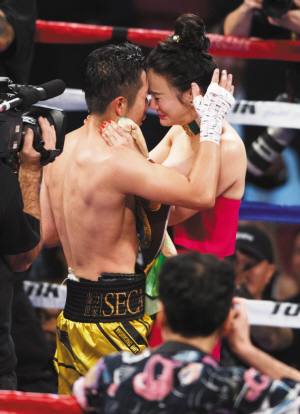 11月5日,中国职业拳手邹市明首次夺得WBO蝇量级世界拳王金腰带,实现了拳击生涯的“全满贯”。图为邹市明(左)和妻子冉莹颖在夺冠之后庆祝。