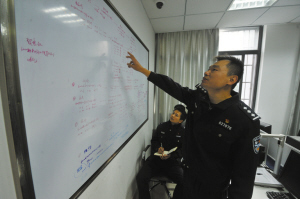 | 图为11月3日下午,市反虚假信息欺诈中心,民警正研究相关案情。记者 崔引摄 |