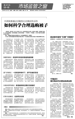 一般来说,我们每个人的人生有近三分之一的时间是在床上度过。躺在床上睡觉,自然离不开被子。冬天的羽绒被,秋冬的蚕丝被,夏天的空调被……不同季节,不同温差,人们对于被子的功能需求也各不相同。 那么,选购被子到底应该注意些什么?如何选购更科学、合理呢? 不久前,宁波市消保委对秋冬季被子商品开展了一次功能性比较试验,相信从中能给消费者以启迪。 “目前市面上各类新材料和新功能的被子不断出现,单件商品价格逐渐走高,有些商家为推销产品甚至过分夸大宣传。”谈及此次被子功能性比较试验,市消保委相关负责人表示,此举是为了引导消费者科学合理消费,并提醒:“选购被子除了外在的品牌、价格、尺寸等因素,更应该综合比较被子的压缩回弹性、保暖性、透气性及纤维含量。” 据了解,本次比较试验的被子样品均由宁波市消保委工作人员以普通消费者身份从大中型商场、超市及淘宝网店随机购买。样品共计21条,其中从实体店采购17条,从淘宝网店采购4条;样品中包括蚕丝被9条,羽绒羽毛被3条,化纤被5条,羊(驼)毛被4条,其生产商和销售商分别涉及上海、广东、浙江、江苏、湖南等5个省(市),基本涵盖了全国主要被子类商品生产区域,其中不乏消费者耳熟能详的品牌,如博洋、罗卡鞭、恒源祥、南极人、紫罗兰等。 全部样品分别进行保暖性、透气性、压缩回弹性和纤维含量测试。根据具体的测试情况(测试情况汇总表详见14版),市消保委特别就此作分析说明。 保暖性测试:保温率和保温系数越高越保暖 保暖性指物体阻止热量散发的能力,是被子最主要的性能之一。由于不同被子的填充物质量不同,规格面积大小也不相同,因此,分别采用了产品的保温率和保温系数(保温系数=保温率/单位面积质量)来表征整个产品的保温效果以及单位面积质量下填充物的保温效果。保温率越高表明产品的保温效果越好,保温系数越高,表明相同条件下该填充物材质的保温效果越好。 保温性的测试方法主要参照GB/T 11048-2009《纺织品保温性能试验方法》进行测试,测试发现:被子的保暖性除了与填充物材质相关外,还与面料的结构,填充物的填充紧密程度和制作工艺等相关,因此填充物材质并不是决定保暖性的唯一因素。 透气性测试:一定保温率条件下,透气性越好舒适 面料的透气性主要与面料的织物结构紧密程度和材质有关,在一定保温率条件下,透气性越好,舒适度越高。此次比较试验共对全部21款面料进行了测试,基本都符合日常生活需求(>5mm/s)。 面料透气性的测试主要依据GB/T 5453-1997《纺织品 织物透气性的测定》进行测试。测试发现:蚕丝被和化纤被的面料透气性要明显好于羽绒被和羊(驼)毛被。这是由于羽绒羽毛被和羊(驼)毛被的面料为了防止羽绒和羊(驼)毛等钻出面料,织物结构需要更加紧密,造成透气性相对较差。 压缩回弹性测试:数值越高商品蓬松性能越好 压缩回弹性主要指被子在受到外力施压后回复到原来状态的特性,主要考核填充材料的蓬松性能。测试填充物压缩率和回复率越高,说明其压缩回弹性能越好,即被子的蓬松性能越好。 压缩回弹性的测试主要参照GB/T 22796-2009《被、被套压缩回复率测试方法》进行测试,测试发现:羽绒羽毛被和化纤被的压缩回弹性能要好于羊(驼)毛被和蚕丝被。 纤维含量测试:全部符合标准 面料和填充物纤维含量,是反映产品质量优劣的重要标志,它体现出产品的质感、透气性及合适度,是消费者选购商品的关键因素,如果标注纤维含量与实际不符,会对消费者产生误导。 本次比较试验中,纤维含量测试方法主要依据GB/T 2910-2009所有部分及FZ/T 01057-2007所有部分。测试发现:所有样品的面料和填充物纤维含量全部符合标准。 小贴士 首先,选购被子尽量到正规商场或品牌专卖店等实体店购买,并优先选择信誉较好的品牌商品。 其次,应根据季节需求以及自身喜好,综合考虑面料、大小、填充物以及价格等因素,科学合理选择被子商品。 最后,一定要仔细看清商品名称,并注意查看其标识上所标注的填充物材质名称及含量,因为根据相关国家标准规定,只有填充物中蚕丝含量≥50%以上时,才能称之为蚕丝被,羽绒羽毛填充物中绒子含量≥50%才能称为羽绒被。宣文