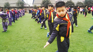 每天早上,邱隘镇中心小学的全体学生都会在操场操练一套独特的书法操。这套《七彩笔韵》书法操共有8节,由该校老师自编,是将书法和广播操、太极拳相结合,以书法的点、横、竖、勾、提、撇捺等基本笔画为原形态,配以研墨和收笔。书法操简单易学、优雅新鲜,深受学生们的欢迎。