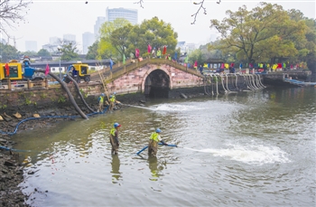 昨日,海曙区城管局联合天河水生态水体专业人员,用干式清淤法清除沉积月湖湖底的5万余方污泥。记者 刘波 通讯员 张黎升 摄