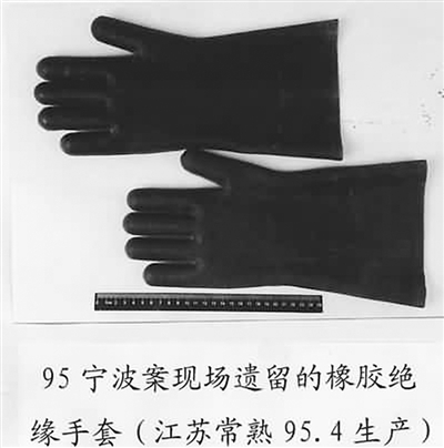 | 1995年宁波案现场遗留的橡胶绝缘手套(江苏常熟1995年4月生产)。 |