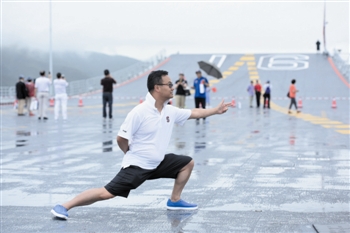 下图:一名香港市民在辽宁舰的飞行甲板上模仿“航母Style”动作。新华社