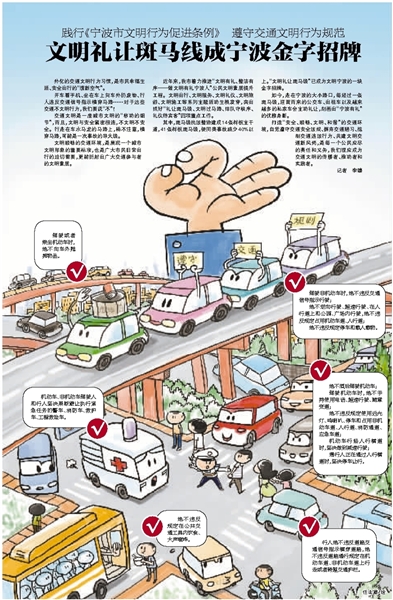 外化的交通文明行为习惯,是市民幸福生活、安全出行的“清新空气”。 开车看手机、坐在车上向车外扔废物、行人违反交通信号指示横穿马路……对于这些交通不文明行为,我们要说“不”! 交通文明是一座城市文明的“移动的细节”,而且,文明与安全紧密相连,不文明不安全。行走在车水马龙的马路上,稍不注意,横穿马路,可能是一次事故的导火线。 文明顺畅的交通环境,是展现一个城市文明形象的重要标准,也是广大市民日常出行的迫切需要,更能折射出广大交通参与者的文明素质。 近年来,我市着力推进“文明有礼、整洁有序——做文明有礼宁波人”公民文明素质提升工程。文明出行、文明服务、文明礼仪、文明旅游、文明施工等系列主题活动生根发芽,突出抓好“礼让斑马线、文明过马路、排队守秩序、礼仪待宾客”四项重点工作。 其中,斑马线执法整治建成14条样板主干道,41条样板斑马线,使同类事故减少40%以上。“文明礼让斑马线”已成为文明宁波的一块金字招牌。 如今,走在宁波的大小路口,每经过一条斑马线,迎面而来的公交车、出租车以及越来越多的私家车会主动礼让,刻画出“宁波有礼”的优雅身影。 打造“安全、顺畅、文明、和谐”的交通环境,自觉遵守交通安全法规、摒弃交通陋习、抵制交通违法行为、共建文明交通新风尚,是每一个公民应尽的责任和义务,我们理应成为交通文明的传播者、推动者和实践者。 记者 李臻