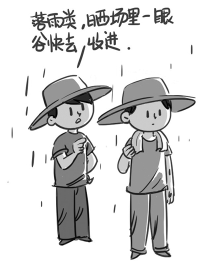 例句:落雨类,晒场里一眼谷快去收进。[下雨了,晒场上的一些谷快去收进。]