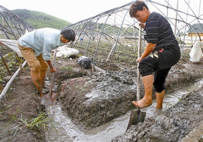 昨天上午,江北慈城镇妙山村草莓种植大户沈建波在疏通草莓田内外排水沟。 记者 徐文杰 通讯员 王笑 摄 |