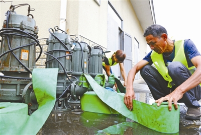 | 昨天下午,桃江雨水泵站内工作人员忙着准备抽水泵、沙袋等防台物资。记者 徐能 摄 |