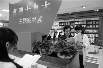 国庆长假到书城购书是不少市民的选择。昨天,来自鄞州史家社区的2名党员居民在宁波书城一楼“喜迎十九大主题图书展”专柜前翻阅所需书籍。