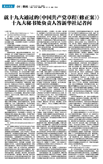 就十九大通过的《中国共产党章程(修正案)》 十九大秘书处负责人答新华社记者问