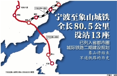 商报讯(记者 范洪)备受瞩目的宁波至象山城际铁路有了最新进展。省发改委官网近期发布了《浙江省都市圈城际铁路二期建设规划(2017~2022年)环境影响评价公示》,其中就包括宁波至象山城际铁路。该线路全长80.5公里,共设车站13座。 此前,象山港大桥的建成结束了象山县不通高速公路的历史。而宁波至象山城际铁路的建设,将结束象山县不通铁路的历史。 根据目前所掌握的信息,宁波至象山城际铁路从钱湖大道轨道交通站点引出,经过横溪、塘溪,跨海到达象山城区,未来可延伸到石浦,其北部走向与目前象山港大桥北接线大体一致。通车后,按照城际铁路时速120至160公里计算,加上停靠沿途各站,乘坐列车从象山城区出发,40分钟就能到达宁波市区。 此外,这条铁路还包括一条梅山支线。根据此前梅山保税港区政府官网消息,梅山支线起于主线宁波至象山城际铁路塘溪附近,向东北方向岔开,止于昆亭,沿途经过咸祥、瞻岐、春晓等地,线路全长21.3公里,设置车站4座,采用高架形式。梅山也将被纳入宁波中心城区半小时交通圈。 在今年7月召开的宁波市交通发展暨铁路建设领导小组会议上,相关负责人介绍,我市今年将加快谋划杭甬、甬台温城际铁路,并推进向慈溪、余姚、宁海、象山的市内城际铁路的建设。未来,宁波至象山城际铁路也将像宁波至奉化城际铁路一样,在市区与宁波城市轨道交通实现对接。早些时候,象山县相关负责人已与车辆制造厂方、高校学者等相关人员一起探讨象山城际铁路建设事宜。业内人士表示,随着象山、慈溪城际铁路建设的推进,未来将实现宁波市域轨道交通全覆盖。