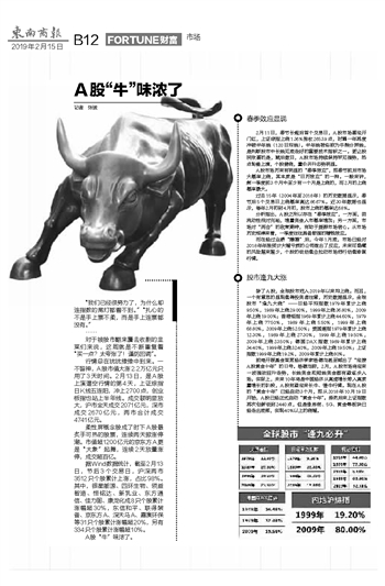 记者 张波 “我们已经很努力了,为什么却连指数的尾灯都看不到。”“扎心的不是手上票不柔,而是手上连票都没有。” …… 对于被股市翻来覆去收割的韭菜们来说,这周就是不断重复着“买一点?太夸张了!谨防回调”。 行情总在犹犹豫豫中到来。一不留神,A股市值大涨2.2万亿元只用了3天时间。2月13日,是A股上演逼空行情的第4天,上证综指日K线五连阳,冲上2700点,创业板指也站上半年线。成交额明显放大,沪市全天成交2071亿元,深市成交2670亿元,两市合计成交4741亿元。 柔性屏概念股成了时下A股最炙手可热的股票,连续两天掀涨停潮。市值超1200亿元的京东方A更是“大象”起舞,连续2天放量涨停,成交超百亿。 据Wind数据统计,截至2月13日,节后3个交易日,沪深两市3512只个股累计上涨,占比98%。其中,银星能源、四环生物、领益智造、恒铭达、新乳业、东方通信、佳力图、康龙化成8只个股累计涨幅超30%,东信和平、联得装备、京东方A、深天马A、嘉澳环保等31只个股累计涨幅超20%,另有334只个股累计涨幅超10%。 A股“牛”味浓了。 春季效应显现 2月11日,春节长假后首个交易日,A股市场喜迎开门红,上证综指上涨1.36%报收2653.9点,时隔一年再度冲破半年线(120日均线)。半年线被俗称为牛熊分界线,是判断股市中长线见底走好的重要技术指标之一。更让股民欣喜的是,随后数日,A股市场持续保持罕见强势,热点轮番上演,个股普涨,量价齐升态势明显。 A股市场历来有明显的“春季效应”,即春节前后市场大概率上涨,其本质是“日历效应”的一种。一般来讲,第一季度前3个月中至少有一个月是上涨的,而2月的上涨概率最大。 过去15年(2004年至2018年)的历史数据显示,春节后5个交易日上涨概率高达86.67%。近30年数据也显示,每年2月初到4月初,股市上涨的概率达68%。 分析指出,A股之所以存在“春季效应”,一方面,因流动性相对充裕,增量资金入市概率增加;另一方面,市场对“两会”的政策期待,有助于提振市场信心。从市场历史规律来看,一季度往往具备较强的赚钱效应。 而在经过业绩“爆雷”后,今年1月底,市场已经对2018年年报预计大幅亏损的公司做出了反应,未来可隐藏的风险越来越少,个股的低估值会拉动市场进行估值修复行情。 股市逢九大涨 除了A股,全球股市进入2019年以来均上涨。而且,一个有意思的显现值得投资者注意,历史数据显示,全球股市“逢九大涨”——日经平均指数1979年累计上涨9.50%,1989年上涨29.00%,1999年上涨36.80%,2009年上涨19.00%;香港恒指1969年累计上涨44.60%,1979年上涨77.50%,1989年上涨5.50%,1999年上涨68.80%,2009年上涨52.50%;美国道指1979年累计上涨12.30%,1989年上涨27.30%,1999年上涨19.50%,2009年上涨23.50%;德国DAX指数1989年累计上涨34.40%,1999年上涨32.40%,2009年上涨19.50%;上证指数1999年上涨19.2%,2009年累计上涨80%。 前海开源基金首席经济学家杨德龙甚至喊出了“迎接A股黄金十年”的口号。杨德龙称,2月,A股市场将迎来一波强劲回升走势,长线资金和短线资金都有望逐步入场。实际上,未来10年将是中国经济从高速增长转入高质量增长的阶段,A股有望迎来长牛、慢牛行情。现在A股的“黄金十年”已经启动3个月,即从2018年10月19日开始,A股已经正式启动“黄金十年”。虽然后来上证指数再次创新低到2440点,但是像券商、5G、黄金等板块已经走出底部,实现40%以上的涨幅。