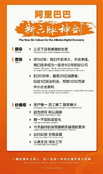 马云在阿里20周年晚会上的演讲(摘录): <<< 青山不改,绿水长流 >>> 真没想到等了十年的这一天,来得那么快,来得那么美好。 为了这一天,我认真准备了十年。这不是一个心血来潮,更不是迫于什么压力,网上还有人传是我害怕什么?过去20年,阿里人从来没有害怕过,我们只敬畏过未来,对未来我们从不害怕。 今天不是马云的退休,而是一个制度传承的开始。今天不是一个人的选择,而是一个制度的成功。 今天的世界正在快速地发展,各种各样复杂的变化,这些变化不管你乐不乐意,它会影响我每一个人。最近几年全球化的挑战、新技术引发的各种焦虑、环境的恶化……各种变化都在释放一种信号,这个信号就是一个新的时代很快到来。 今天所有的烦恼、所有的焦虑、所有的困惑,我认为是一个新时代来临之前的阵痛。未来30年,世界会发生很多天翻地覆的变化。因为技术革命所带来的影响,远远超越大家的想象。这次技术革命是人类有史以来将会发生最深刻的变革。 无论是人工智能、无论是大数据,还是我们快进入的5G、IoT时代,所有这些都希望解决人类三个问题:可持续发展、普惠和利他……如果技术不能解决这些问题,技术就毫无意义。不解决这些问题,我相信这个世界会充满各种各样的矛盾。 如果过去的20年是互联网公司的20年,那么未来的30年是用好互联网技术的30年。 这个互联网时代是给每一个人的机会,只有你是否愿意改变自己,所有的阵痛都只能通过改变自己来完成。不要试图去改变别人,我们每个人都要走出昨天的自己。 未来的世界,如果你希望成功、你的企业想成功、你个人想成功,那你记住,你不仅仅要为自己着想、你要为别人着想、为世界着想、为未来着想。 很多人说马云你讲话总是站得很高,从人类、从世界(的角度)。我没有刻意。20年来,我相信这些我们坚持这些。你笑话,我们也这么说;你信,我们当然更高兴。 我们这一代人马上要面临挑战,进入、拥抱数据时代。这次变革,是人类对自己的挑战,是每个人要改变自己。 阿里人商业决定很不容易,但是价值观的选择更为痛苦。过去20年,我们经常被怀疑、被挑战,但是我们对自己、对未来坚信不疑,甚至有人说我们是永不悔改。 因为阿里不愿意做一家只能挣钱,而又非常平庸的东西。我们的目标从来不是为了打败对手,而是希望给世界带来更好的变化。 过去20年的努力,阿里巴巴拥有了最好的人才、最好的技术、最多的资源,但这不是我们可以炫耀的资产,这是社会对我们巨大的信任。社会把最好的人才,社会把可以开拓技术的机遇,把很多的信任给了我们,我们每个人都会说感恩,每个人都在说感谢,但我希望阿里人感恩社会信任最好的办法,就是用行动去给社会带来更多的惊喜。 我希望未来20年,我们的责任是用好这些资源、这些人才、这些技术,让世界更加绿色、让世界更加普惠、让世界更加可持续发展,同时让我们这个世界变得更加柔软和温暖。 我们国家解决经济最大的机会在于发展内需。如果把中国的内需发展起来,不仅让中国的经济起来,让世界的经济也会起来。 阿里人,今天我们所做的,无论新零售、新制造、走向未来的新消费,中国的内需做的不好,阿里有责任,中国的内需做得好,跟阿里没有关系。 还有巨大的机会,是新全球化。今天我们中国人都很自信,世界在害怕中国,在害怕技术,害怕强大的公司。我们希望技术是善意的,给人带来的是希望,而不是绝望。我们希望阿里巴巴在未来参与新一轮的全球化,给世界带去机会,让全世界货通天下。 阿里巴巴今天已经变成了一家技术公司。技术的强大在于它对社会带来的价值,给人类带来的温暖。阿里云、达摩院,阿里巴巴所有的技术部门、技术人员,用自己的能力、想象力给世界带来机会。 未来中国巨大的挑战是就业,大力发展现代服务业,发展更多能够创造就业的服务业是阿里人今天你们手上的资源,人才和技术应该全力以赴。只有担当起这些真正的重要的问题,我们才能走102年。 阿里的未来,不是要证明我们能赚102年的钱,而是我们要证明我们愿意担当102年的责任。 至于我自己,我把自己想得很明白……在这个世界We are nobody。 人生不是你取得了什么,而是你经历了什么。世界那么美好,有那么多事,我都想去体验,都想去尝试一下。而且世界上还有那么多不美好、不对的事情,不尽人意的地方。我觉得我是要去折腾折腾。 2013年,我离开了CEO的岗位,我本以为不会那么忙,没想到过去的6年我比以前更忙。不当阿里巴巴董事长,不等于我退休,我是不会停下来的。阿里巴巴只是我很多梦想中的一个而已,我觉得我还很年轻,有很多地方我都想去玩玩,都想去折腾。很多事情,教育、公益、环保,这些我一直在做,但我觉得我可以做的更好,花更多的时间,也许这是我应该做的事情。 过了今天晚上,我就要开启新的生活。 世界那么好,机会那么多,我又那么爱热闹,哪里舍得这么年轻就退休离场。 我希望换个江湖,青山不改,绿水长流,后会有期,谢谢大家。