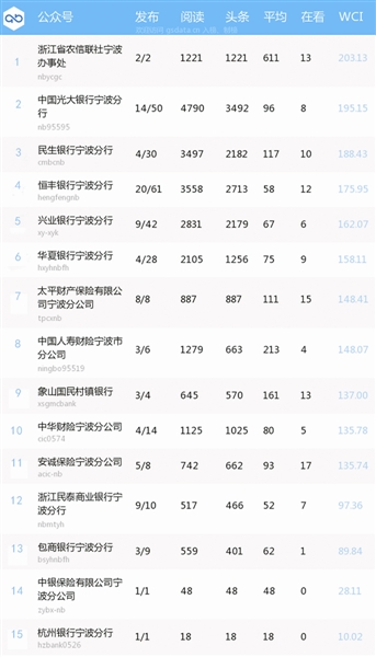 《宁波新媒体微信公众号影响力月度排行榜》第5期来啦!本期榜单共检测样本400余个,统计时间为9月1日—9月30日,统计截至10月8日9时整。榜单以清博数据微信传播指数WCI为排名依据,采集数据,通过综合算法自动生成,确保排名的公平公正。 自媒体:本月“最航运”WCI值下降209.98 本月自媒体类公众号排行榜中,“跑步指南”以149w的总阅读数和932.87的WCI指数位居榜首,“宁波头条”和“宁波热线”分列第二、第三位。 9月20日,“跑步指南”发布的文章《人到中年胖成球啊!!!》,以漫画的形式,描绘中年人从小时候的“运动员身材”如何一步步胖成“球”,趣味十足,观看性强。这篇文章刊发在中秋节小长假后,当大家在假日里胡吃海喝,体重飙升后,会针对性寻找此类文章,进行阅读。 上月的风云榜第9名“最航运”滑落至本月第52名,未列入风云榜前30名内,WCI值下降209.98,主要体现在看数下降多。 上月自媒体潜力榜中,“象山鲜柚生活”发文4篇,位于第2名,本月发文20篇,名次却下降5名,主要是头条阅读量下降,这说明头条文章的质量影响着整个号的WCI值。 金融业:“宁波银联UnionPay”升至风云榜第3名 本期金融业风云榜中,前三名终于有了变化,虽然榜首依旧是“宁波银行”,但是“宁波银联UnionPay”升至风云榜第3名。 9月25日、9月26日和9月27日,“宁波银联UnionPay”分别发文《云闪付1分钱停车又来了!》、《定了!银联邀您5折乘地铁到年底!!!(内附常见问题答疑)》、《强势回归!银联邀您1分钱乘公交十月再登场!》,文章中不仅给出实实在在的福利,还对一些可能存在的问题进行答疑,接地气、重民生、惠民意,导致这个时间段WCI值上升迅速。 上月“中国光大银行宁波分行”WCI值上升291,跻身风云榜第7名。但本月,“中国光大银行宁波分行”竟然名次跌落,进入潜力榜。从这里可以看出,微信公众号需要一直维护,一次的名次上升并不能代表永远。 “宁波新媒体微信公众号影响力月度排行榜”由宁波日报报业集团都市报系金诺商学、宁波市新媒体研究中心权威发布,排行依据清博微信传播指数WCI。 微信传播指数WCI:通过微信公众号推送文章的传播度、覆盖度及公号的成熟度和影响力,来反映微信整体热度和公众号的发展走势。 榜单每月发布一期(月榜),旨在打造宁波新媒体权威微信风向标。(其他榜单可扫描下方二维码,关注“宁波市新媒体研究中心”官方微信公众号进行查看)