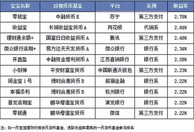 在互联网宝宝收益率排行榜中,上周,苏宁零钱宝排名第一,对接的货币基金是中融货币E,七日年化收益率为2.7%;同花顺收益宝排名第二,对接的是长城收益宝货币A,七日年化收益率为2.64%;腾讯理财通余额+排名第三,对接的是国富日日收益货币A,七日年化收益率为2.46%。