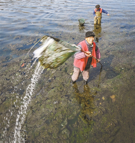 连日来,尚田镇开展劣V类水排查,严查严控农业面源污染和工矿企业排污,并加大处罚促改力度。此外,该镇还完善长效机制,加快推进农村生活污水治理工程和污水纳管工程。 图为护河人员正在清理县江尚田段。