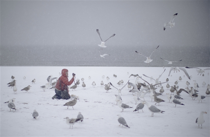 3月10日,在美国纽约,一名女子在暴风雪中拍摄海鸥。
