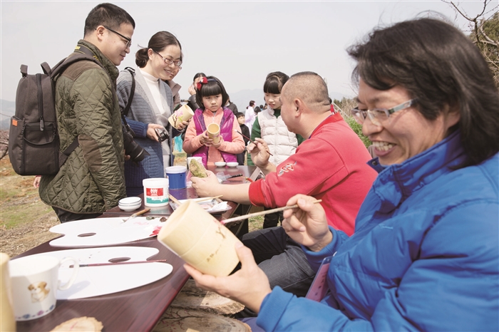 昨天,在溪口镇新建村世界桃街,来自溪口镇武岭西路13个画廊的10多位画家在桃园描绘春景,并将作品免费送给游客。据了解,此次桃园绘春活动由区文联主办,区油画家协会承办,是水蜜桃文化节的系列活动之一。记者 袁伟鑫