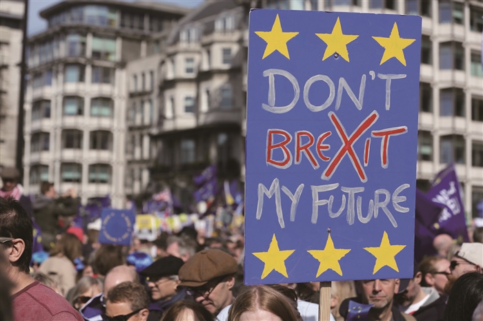 3月25日,在英国伦敦,民众手持标语反对英国“脱欧”。数万名来自英国和欧盟其他国家的民众25日走上伦敦街头举行示威游行,抗议英国脱离欧盟。英国政府宣布将于29日正式开启“脱欧”程序。 新华社发