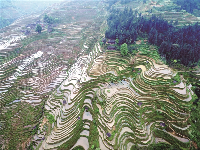 4月17日航拍的贵州省月亮山梯田风光。春耕时节,贵州省黔东南苗族侗族自治州榕江、从江两县交界处的月亮山百里梯田春意盎然。秀美的梯田与连绵起伏的青山、古色古香的民族村寨相映成趣,从空中鸟瞰犹如一幅画卷,美不胜收。 新华社发