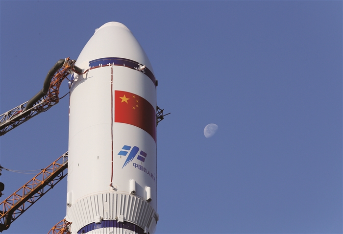 4日17日拍摄的长征七号遥二运载火箭与天舟一号货运飞船组合体局部。当日7时30分,承载着长征七号遥二运载火箭与天舟一号货运飞船组合体的活动发射平台驶出总装测试厂房,垂直转运至发射区。天舟一号货运飞船计划4月20日至24日择机发射。新华社发
