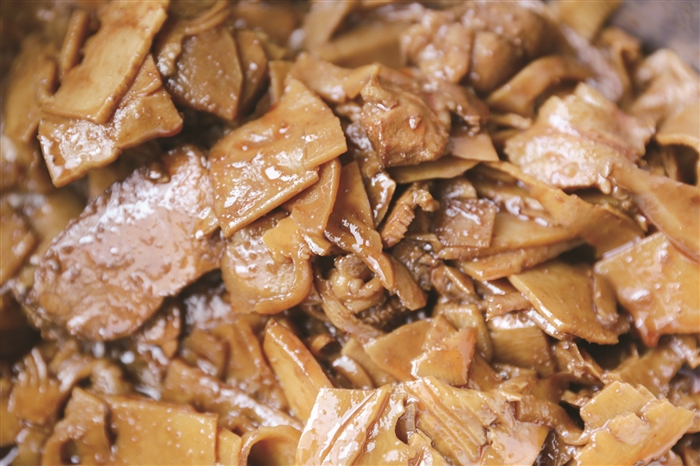 漂洗笋片 焯猪肉 烧回锅肉 炒酱 记者 李露 这个季节,让猪肉和黄泥拱笋相遇是必须的,这对最佳组合就叫“回-锅-肉”! 回锅肉是奉化一道有名的老底子美食,以至于在笋忙时节,回锅肉做得好坏,成了评价主妇厨艺高低的重要标杆。提及回锅肉,家家户户都有自己的制作方式,但是回锅肉的老底子奥秘,你知道多少呢? 老董与回锅肉的缘分 “老董啊,回锅肉给我来一斤。”“好嘞!”“老董啊,我也要一斤。”……东门菜场入场口的董记回锅肉前,今年78岁的董深山边挥动着勺子给顾客们装袋称量,边与这些老客们拉几句家常。董深山就是大家口中的老董,一个头发灰白,但是精神抖擞,声如洪钟的老顽童。据说,董记回锅肉是奉化首家散装制作回锅肉的店铺,其制作的回锅肉一直备受大家推崇,说是有奉化老底子的味道。 老董说,他与回锅肉打交道已有48年,要说回锅肉的奉化老底子味道,还得从1969年讲起。那年,老董还是个小董,当兵退伍回来的他进入了当时如日中天、赫赫有名的奉化食品厂工作,开始了与回锅肉不能割舍的缘分。 计划经济年代,奉化食品厂贴牌生产的梅林牌回锅肉罐头,是出口海外赚外汇的畅销产品,即使是老董这样一手负责回锅肉生产的老员工依旧很难品尝到自己生产的回锅肉。“那个年代,过年的时候给我们分到一些回锅肉的下脚料,都能开心好半天。”老董说,既然大家都喜欢吃这口,那就得把老底子手艺传承下去。于是在1990年,从奉化食品厂退休的老董在城基路开了一家制作散装回锅肉的店铺,这一开就是十几年。 回锅肉的美味秘籍 奉化境内天台、四明山脉非常适宜大毛竹生长,石门、岩头、董李、大堰等地都是毛竹的主产地。据《奉化市志》记载,早在南宋时,溪口石门就以种植大毛竹闻名,所产毛竹体大质好,清代更有“石门种竹赛淇园”之说。 除了可以制作竹制工艺品以外,毛笋更是奉化人不可缺少的菜肴。“其实笋本身是没有味道的,但是一旦与其他食材叠加往往会迸发出不可思议的火花,回锅肉就是极佳的例子。”餐饮协会秘书长孙敦民介绍,回锅肉的美味秘籍在于笋上。 清明前后,让宁波人舌尖生津的除了海鲜还有山珍,黄泥拱笋就是其中少不了的一道美味。“黄泥拱”是品质好毛笋的乡间叫法,因其笋体深埋在肥沃的黄土层下,笋头将出未出,将泥土拱成小包,裂开了一条缝,里面探出了笋尖,便称为“黄泥拱”。所以老客们都知道,最好吃的回锅肉必定是在黄泥拱笋上市期间,那口感与用去年笋忙时节存下来“清汁笋”做的回锅肉完全不可比。 近几年,老董关掉了开了十几年的铺子,每年只在黄泥拱笋上市期间才出摊销售回锅肉,这让吃惯了老董家回锅肉的老顾客们十分不习惯,但是转念一想,也就这时节的回锅肉才有奉化老底子的味道,心里也就平衡了许多。 老底子制作的回锅肉 提起回锅肉,老董的嗓门总是格外洪亮,他总爱搅动着大钢桶里的回锅肉,给顾客们介绍回锅肉汤色鲜亮的秘诀。其实回锅肉虽然看似简单,只有毛笋与猪肉两种食材,但是要做得美味,工序还是十分繁杂,好在耄耋之年的老董已经培养出了自己的继承人——女儿董英梅,有她在一旁帮衬,老董能稍稍松一口气。 老董说,他的董记回锅肉,制作一锅,光准备工作就得做一整天。要先将黄泥拱笋焯熟之后用冷水浸泡半天,去掉毛笋里的草酸,同时软化毛笋的粗纤维,使其口感没有涩麻味且更易入味。漂洗笋的同时还得处理猪肉和炒酱,猪肉焯去血水切成大小合适的肉块,然后用肥猪肉炸制而成的猪油热锅,放入十多种调料炒酱,其中一种更是有名的中药材,老董说这就是他家回锅肉汤色异常通透鲜亮的秘诀。准备工作之后,就需要将漂洗过的黄泥拱笋、切成块的猪肉和炒好的酱放入锅内炖煮几小时,将笋的素鲜,猪肉的荤鲜和酱的香鲜完美地融合在一起,才是一道真正的回锅肉。 就像“一千个人眼里有一千个哈姆雷特”一样,对于回锅肉口感正不正宗,奉化本地人心中都会有自己的一套衡量标准,但相同的是即使我们远在异乡,都肯定忘不了那咸香扑鼻的老底子味道。