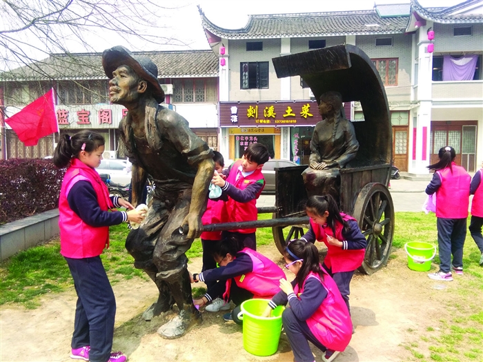 武岭小学积极响应整治号召,开展“‘月护景区’,保洁古镇三里长街雕塑”活动。