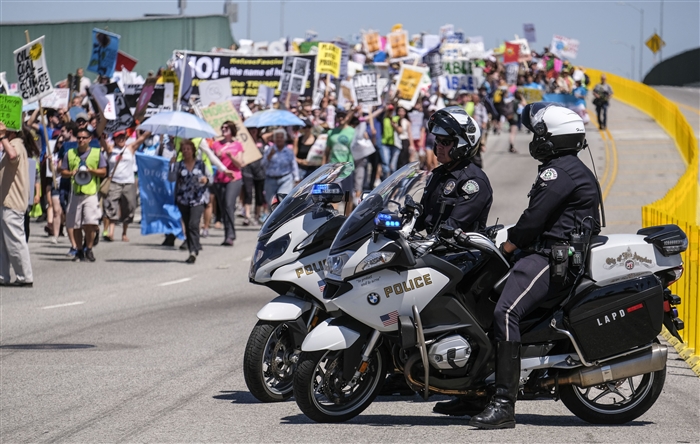 4月29日,在美国加利福尼亚州洛杉矶,警察在“人民气候游行”队伍旁警戒。当日,全美举行370多场“人民气候游行”,美国民众纷纷走上街头反对特朗普气候政策“开倒车”。 新华社发