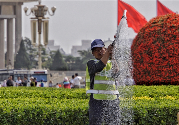 4月30日,园林养护人员在北京天安门广场为花坛浇水。“五一”小长假期间,众多劳动者坚守岗位度节日。 新华社发