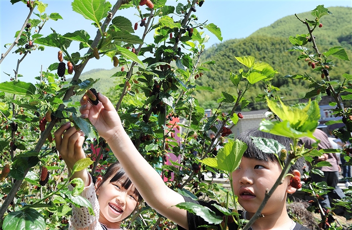 记者 许犇 通讯员 王加廷 裴庚益 本报讯 “摘一颗熟透的桑果丢进嘴里,稍一咬,汁水溢满唇齿,香甜流遍全身。”昨天,2017年奉化尚田桑果节暨宁波禾中乡创全域旅游发展论坛火热上演,来自宁波各地的游客涌入桑果基地,体验采摘的乐趣。尚田镇通过桑果农业科普、桑果美食、桑果文创产品等,让本次桑果采摘游成为该镇全域旅游又一个精品线路。 昨天,来自宁波纺织学院的学生们,穿着纯手工制作的古风服装摇曳在田间地头,让参加桑果节的游客们在满足味蕾的同时,也得到了眼球的享受。现场,桑果扎染DIY、桑果手工文创产品展示、桑果主题美食等,充分展示了农业文创的魅力。同日,宁波禾中乡创全域旅游发展论坛也在“桑田论剑”。来自宁波的乡村全域旅游行业的专家、企业家、游客代表等,分三个阶段、三个层面探讨了“乡村+”的政策落地、市场开拓等可能性,为尚田全域旅游发展模式指明了方向。 图为游客在桑果地欢乐采摘。 记者 王红雨 摄