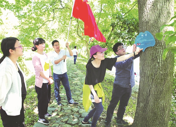 日前,大堰镇团委启动“共青林、共青池、共青路”创建项目,动员镇村志愿者在后畈村为古树林及百年古树挂科普牌,并认领养护,为创建省小城镇环境综合治理样板镇贡献青春。图为挂牌现场。