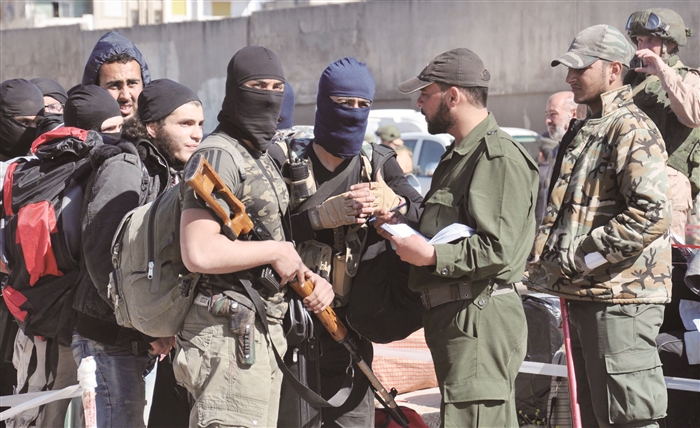 5月21日,在叙利亚中部重镇霍姆斯市,准备撤离的反政府武装人员经过检查站。