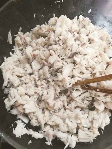 2.用刀剔出鱼肉,注意不要鱼皮,并且将它们压碎。