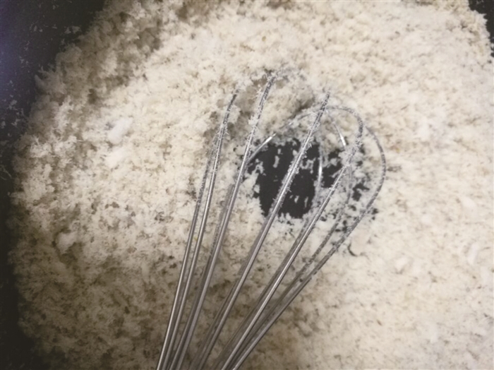 3.不粘锅放少许油,放入鱼肉入锅翻炒,炒至鱼肉蓬松时可加入酱油、盐、糖,继续翻炒一会儿,入味即可出锅。